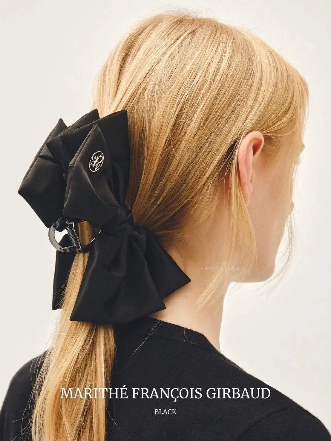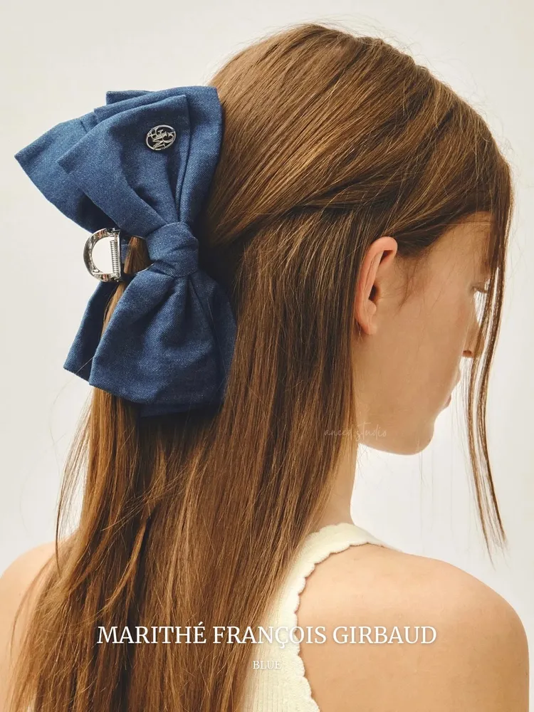 顏色:牛仔藍色 / 緞面黑色 尺寸:寬18×高11cm 材質:cotton100% (藍色) polyester100% (黑色) 蝴蝶結版型做得很漂亮🎀 牛仔藍帶一點休閒感 顏色很耐看 黑色是緞面材質 整體更有精緻感 怎麼夾都很有造型感🇰🇷😻